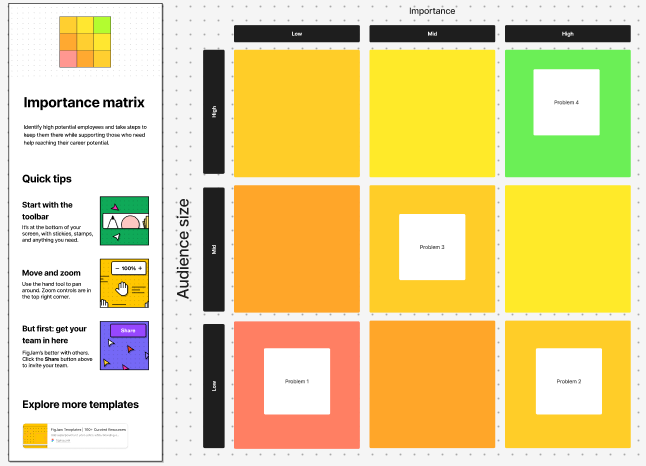 This is a great template for prioritising the problem you want to solve. You look at how many of the audience you think it will influence from few to many. And then you calculate the importance from low to high.