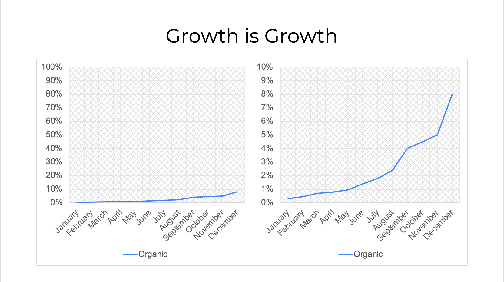 In the early stages the focus shouldn’t be on the absolute number e.g. 0.8% of your traffic being organic may sound low. But if its grown from 0.4% in two months, thats 100% growth.
